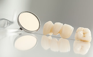 Alternatively, crowns can be used in conjunction with a custom-made dental bridge to replace one or more missing consecutive teeth. Patients who have found themselves dissatisfied with the removability of traditional dentures in the past may prefer bridges because of their more stable state. The crowns are attached over nearby healthy teeth to hold the new bridge securely in place, helping you chew, speak, and smile with confidence.